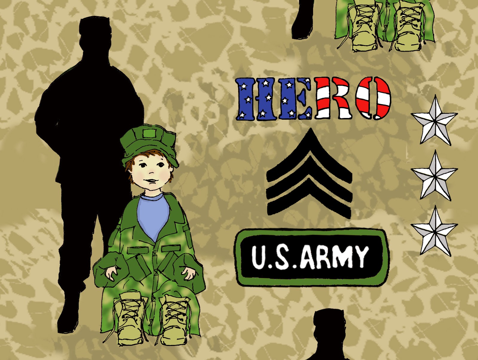 Most children want to be just like their hero at some point in their lives. A hero can wear many hats and perform many different duties and rolls. When I asked my 9 and 12 year old boys who they thought some heroes in their lives were, they responded by listing just about every different military person they could think of. They also included firefighters and police officers in their list...with mom and dad thrown in too for good measure. :) I decided on a military (army) theme for my HERO design to honor our everyday SUPER HEROES. Thank you for all you do!